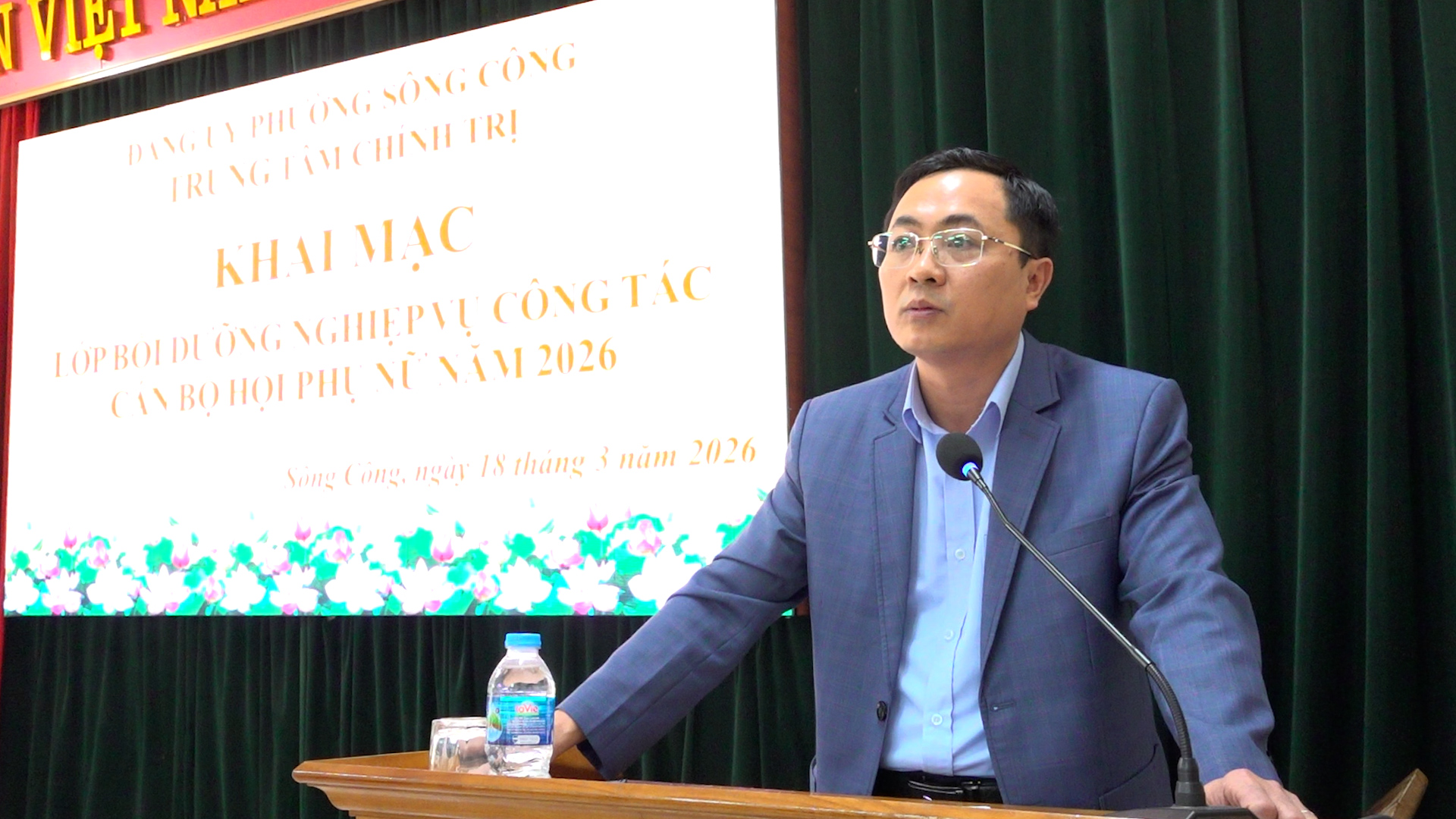 Nhằm tiếp tục nâng cao chất lượng đội ngũ cán bộ Hội đáp ứng yêu càu nhiệm vụ trong tình hình mới, ngày 18.3, Trung tâm Chính trị phường Sông Công phối hợp với Hội Liên hiệp Phụ nữ các phường Sông Công, Bách Quang, Bá Xuyên tổ chức lớp bồi dưỡng kiến thức, nghiệp vụ công tác Hội phụ nữ năm 2026. Đồng chí Nguyễn Sinh Hùng – Phó Bí thư Thường trực Đảng ủy, Giám đốc Trung tâm Chính trị phường Sông Công, dự và phát biểu khai mạc.